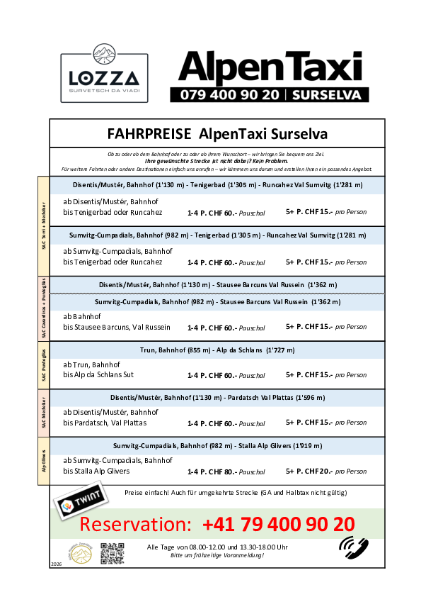 Der Greina Bus bietet ebenfalls einen Shuttle Service vom Bahnhof Rabius nach Teningerbad oder umgekehrt im Val Sumvitg an!